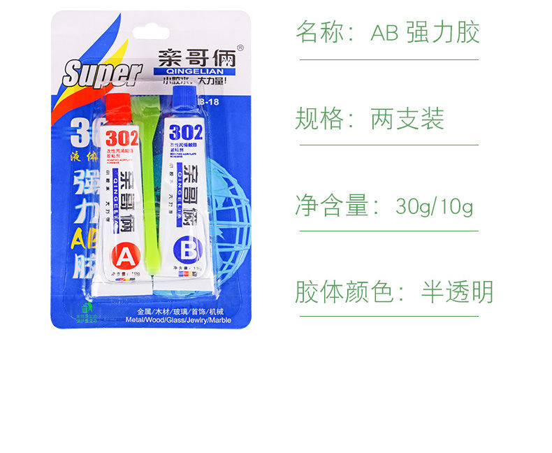 302AB膠全能膠強(qiáng)力膠水粘金屬塑料陶瓷玻璃木材大理石通用AB膠水600/件30/盒085B25-1-2